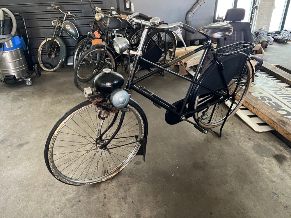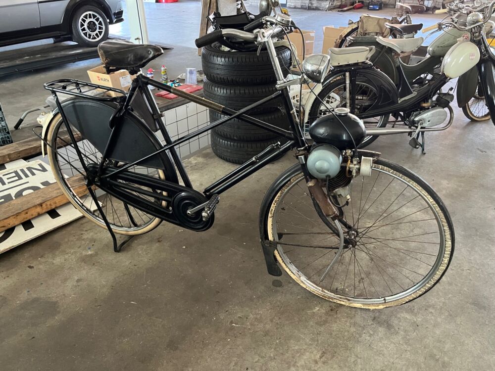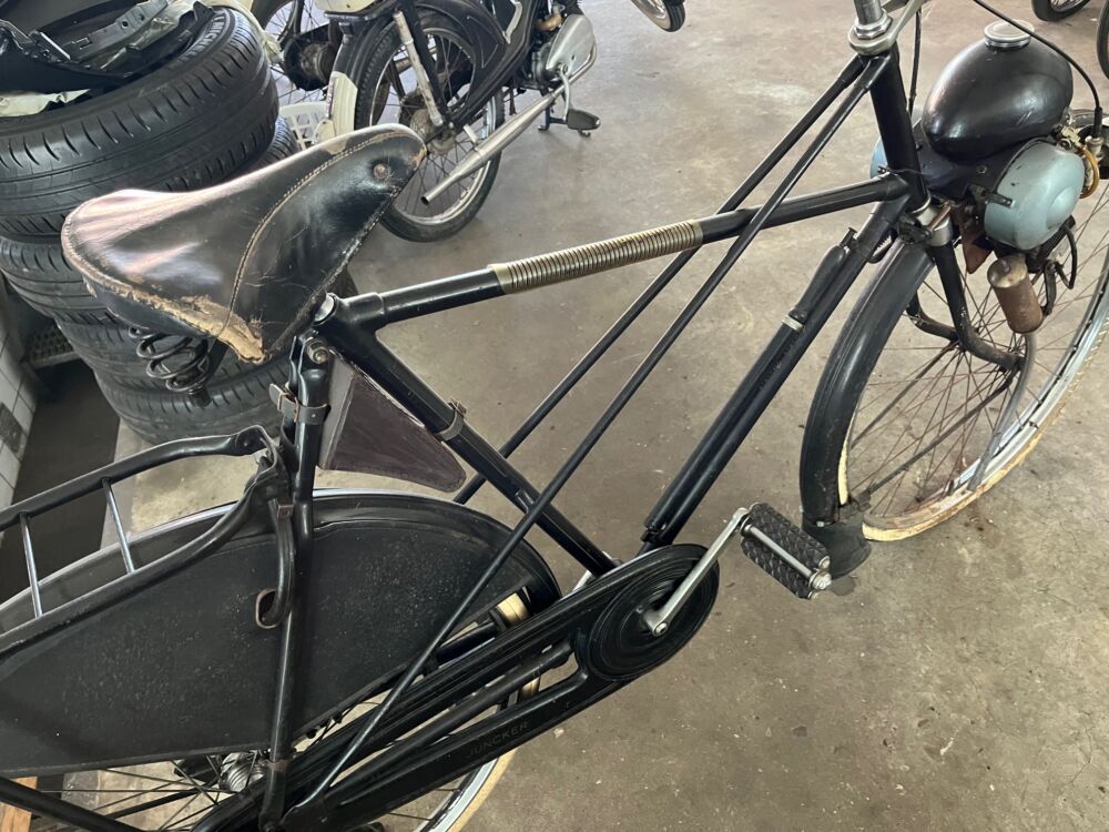 Berini Eitje op een mooie originele en ongerestaureerde Juncker rijwiel met kruisframe , enkel het voorspatbord moet opnieuw worden gespoten