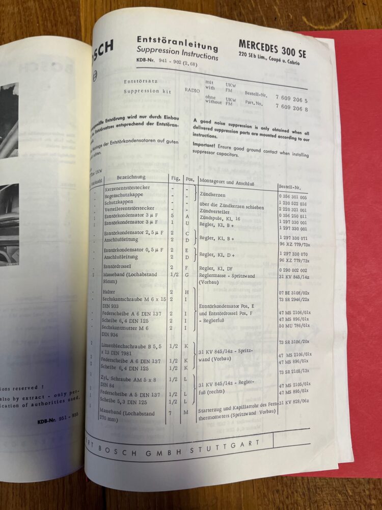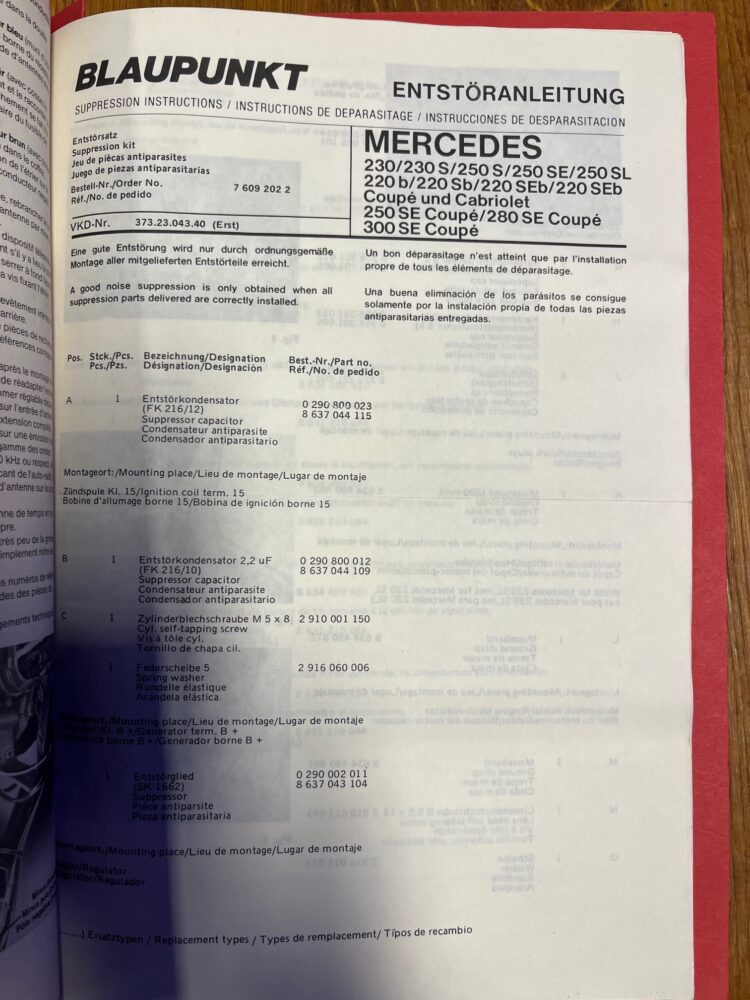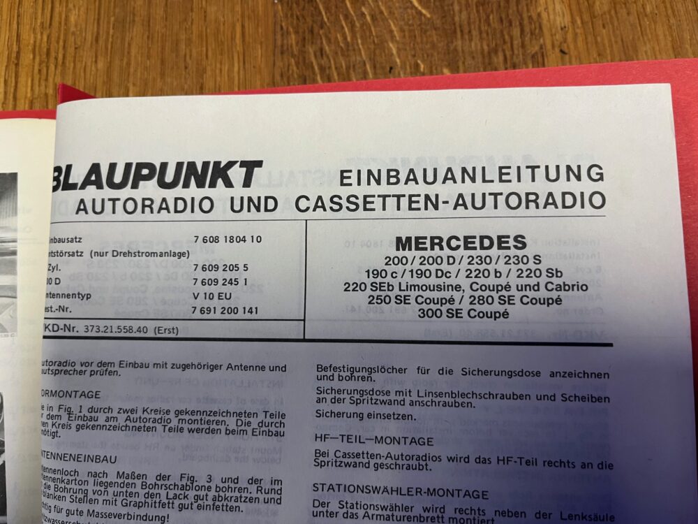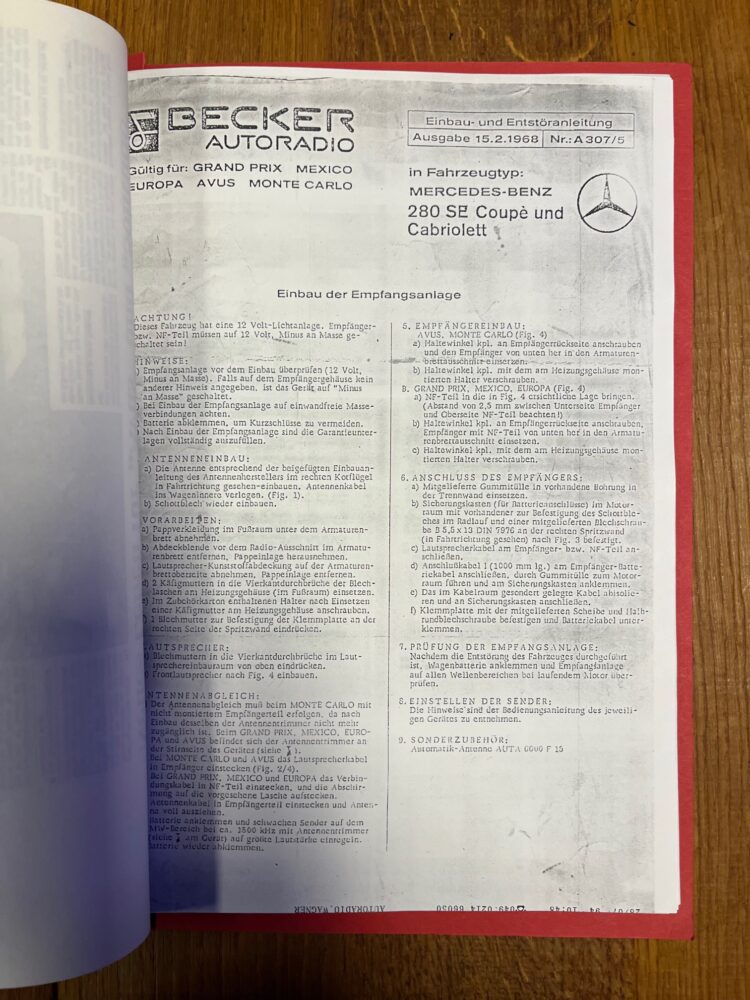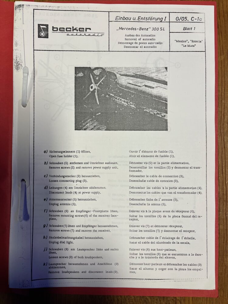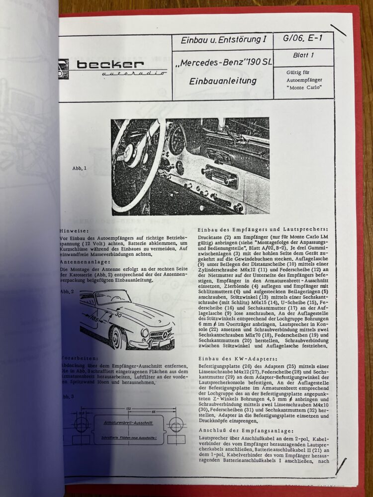 Becker en Blaupunkt radio inbouw handleidingen voor diverse type Mercedes ook 190 SL en 300 SL , ook los te koop of als hele map