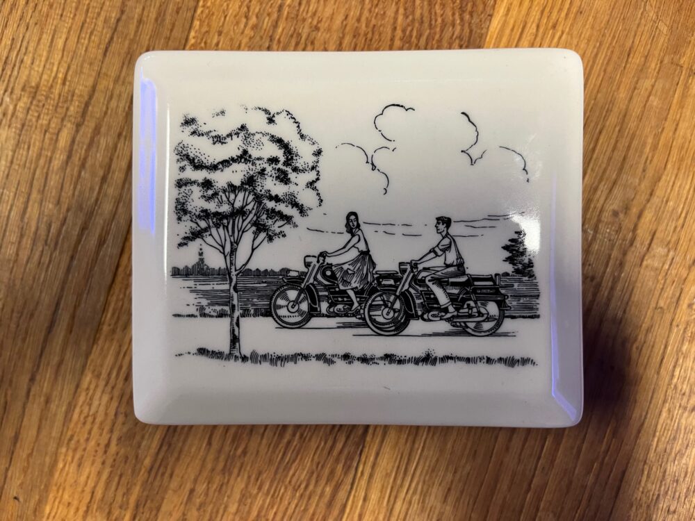 Deze bijzonder mooie aardewerk doos was een relatiegeschenk van Sparta aan haar dealers in 1962